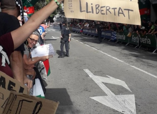 La Coordinadora d’ONG Solidàries denuncia la detenció d’una persona que ahir va protestar pacíficament contra la participació de l’equip ciclista d’Israel en la contrarellotge de la Vuelta a Figueres. El detingut ha passat tota la nit a comissaria, com si es tractés d’un delinqüent, quan en realitat exercia un dret fonamental: el dret a la protesta i a la llibertat d’expressió. Foto: Alt Empordà amb Palestina