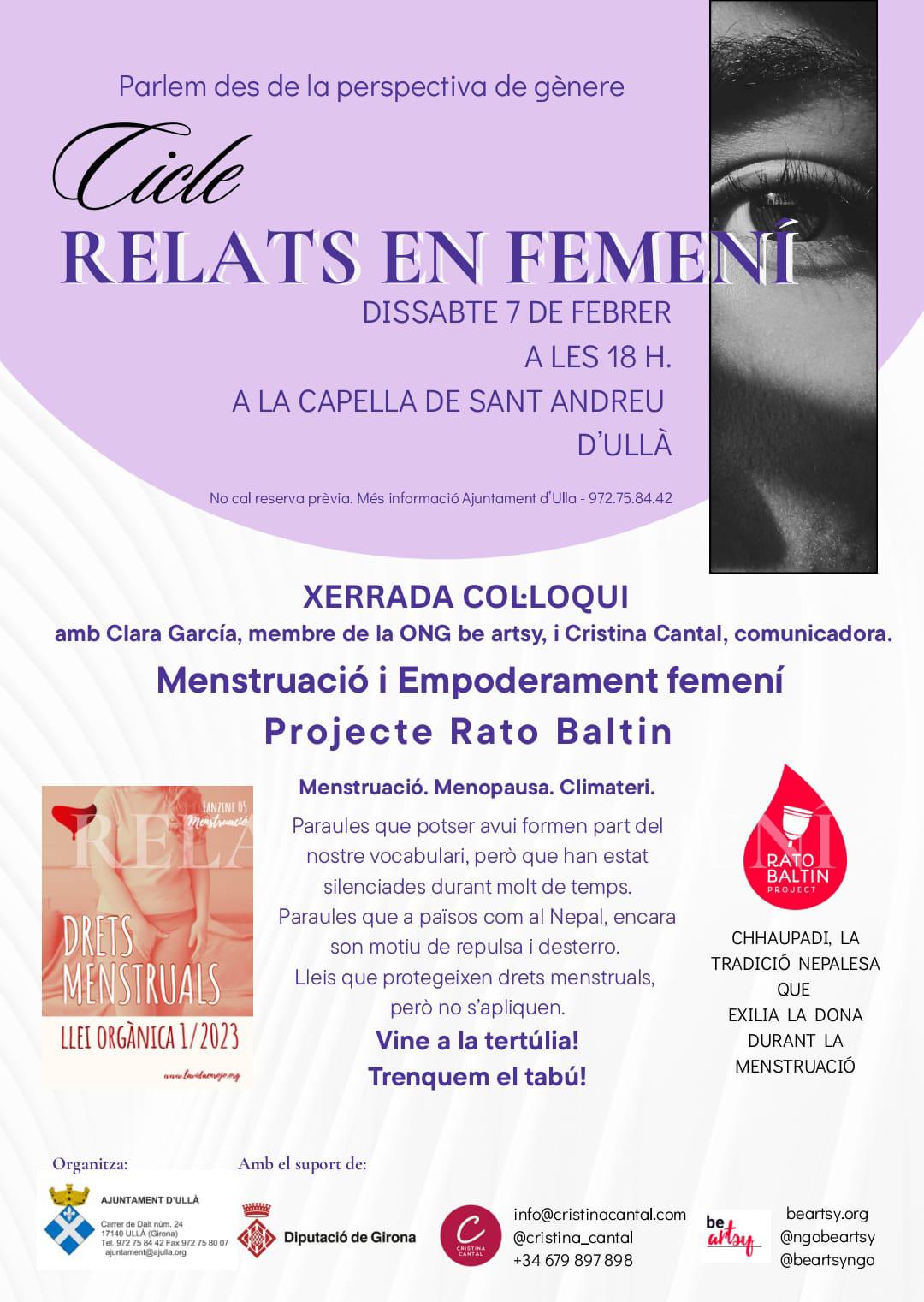 La Clara García, membre de la ONG be artsy i la Cristina Cantal, comunicadora, conduiran una xerrada col·loqui dins el cicle Relats en femení, centrada en la menstruació i l'empoderament femení. Una conversa oberta per parlar sense tabús sobre menstruació, menopausa i climateri, i per reflexionar sobre els drets menstruals des d'una perspectiva de gènere.